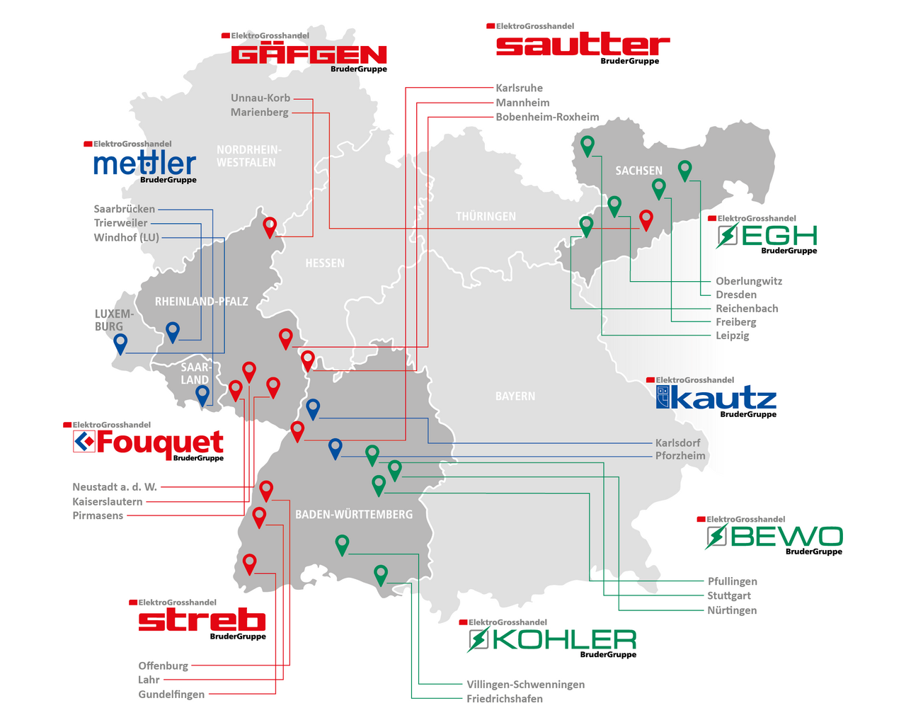 Mit Elektrogroßhandel, Elektroanlagentechnik und Küchenstudios in Baden-Württemberg, Rheinland-Pfalz, Saarland, Sachsen und Luxemburg.